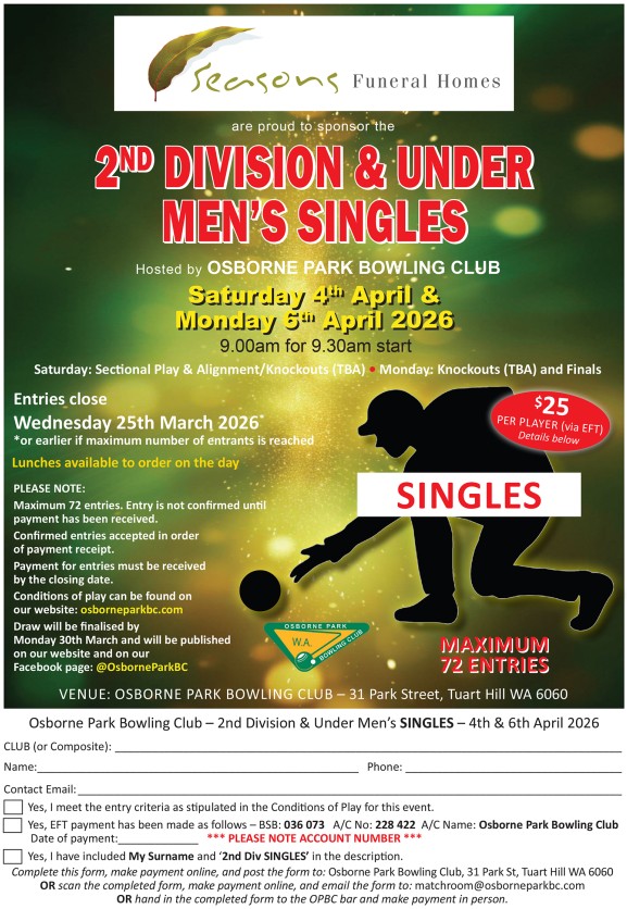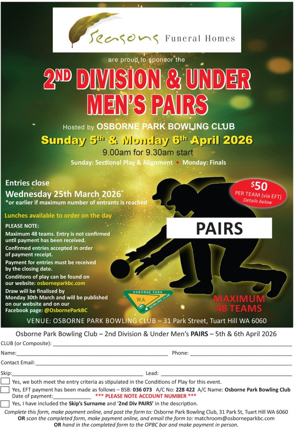 | 5th/6th April | Osborne Park | Pairs | Mens | FLYER