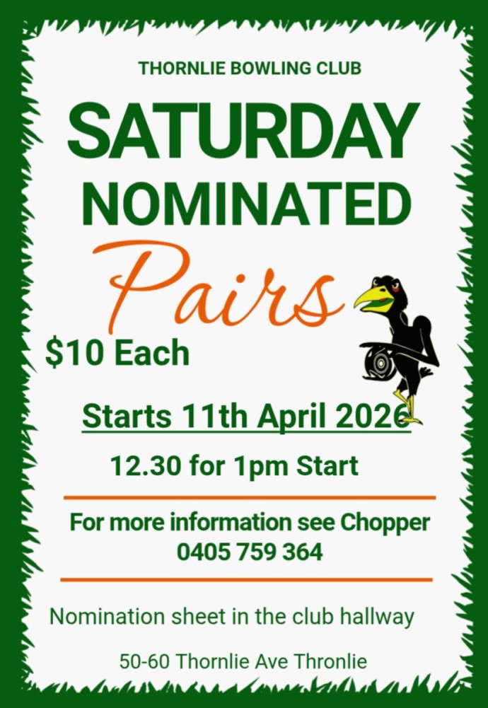 | Thornlie | Pairs | $10 | 12.30pm for 1pm | FLYER |