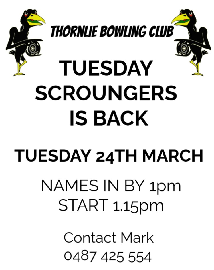 | Thornlie | Scroungers | $10 | 1pm for 1.15pm start | Mark - 0487425554 | FLYER |